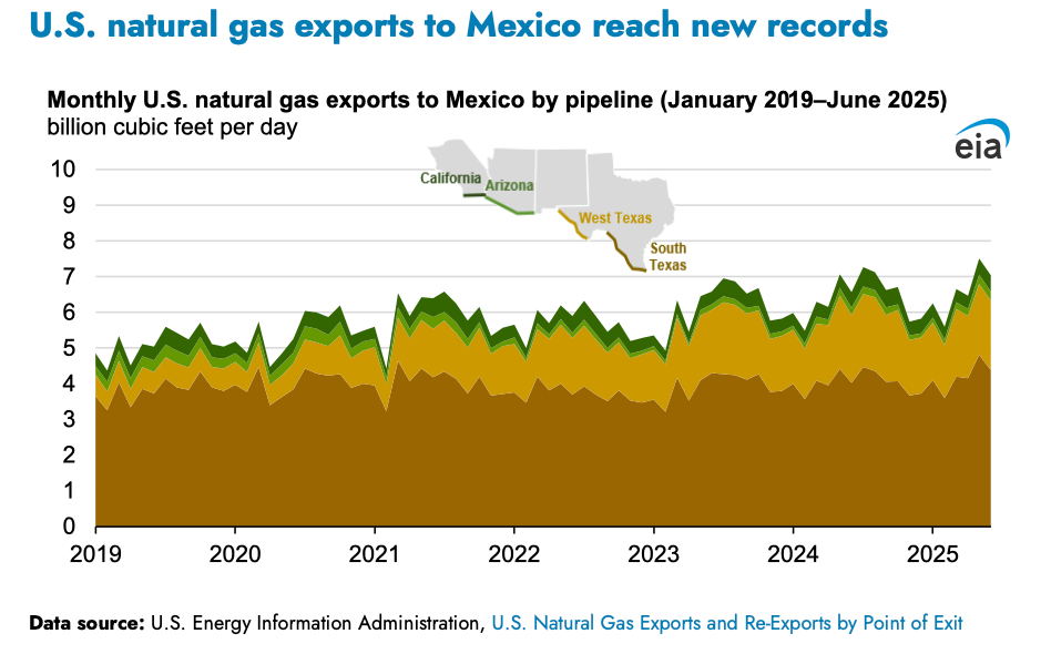 US natural gas exports to Mexico hit a record 7.5 billion cubic feet per day in May 2025, up 25% since 2019.