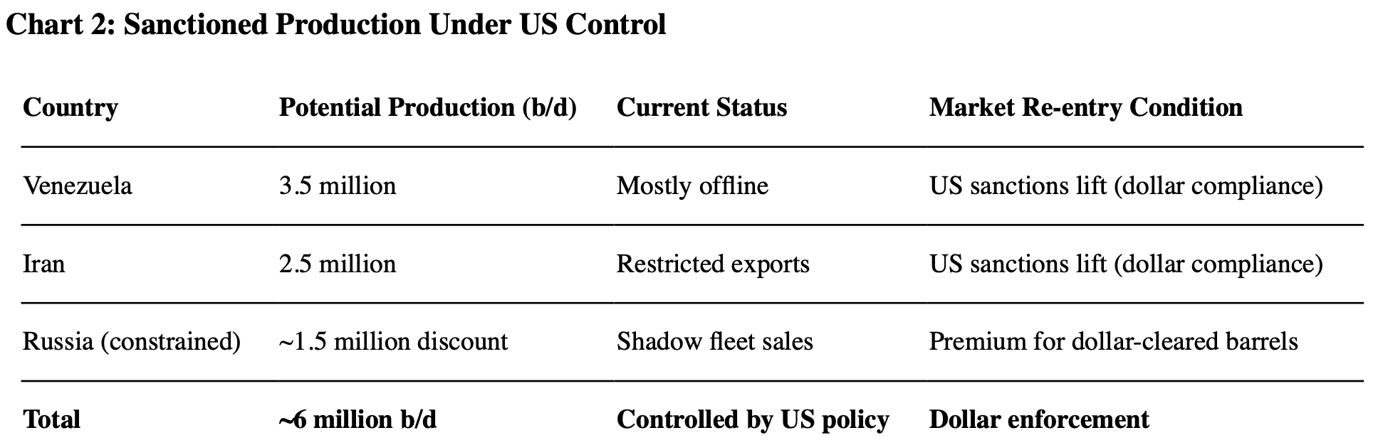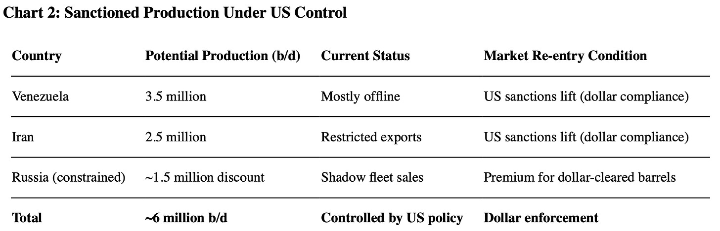 Combined, US sanctions control roughly 6 million barrels per day of production. That is the equivalent of OPEC’s entire spare capacity. Access to global markets means dollar compliance first. Everything else second.