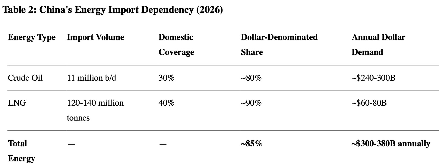 The 2022 sanctions precedent looms over every Chinese central banker’s spreadsheet, but here is the constraint they cannot escape… China imports 11 million barrels per day of crude oil and rising volumes of LNG heading toward 140 million tonnes annually by 2030. Nearly all of it priced in dollars.